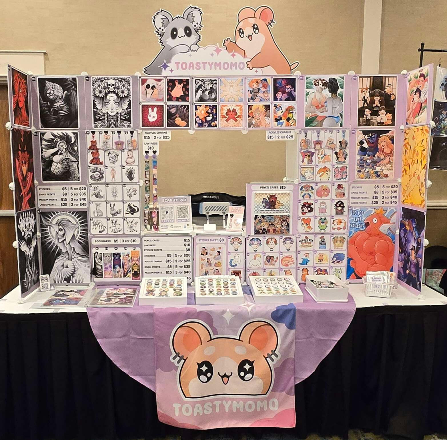 illustrator and 3D modeler creating works that both frighten and delight! Her artwork features original content as well as multi-fandoms including, but not limited to, Dorohedoro, JJBA, Pokemon, and Trigun!When she isn't at her day job, Toasty is hard at work prepping for conventions, streaming, opening her online shop, and working on commissions. She loves spending time with her amazing partner and perfect lil hamster daughter, Toffee! Her current hyperfixations include Dorohedoro, Pokemon, JJBA, FNAF, ACNH, Hades (game), and Corgis!Everything ToastyMomo creates is made entirely by hand WITHOUT THE USE OF ANY GENERATIVE AI